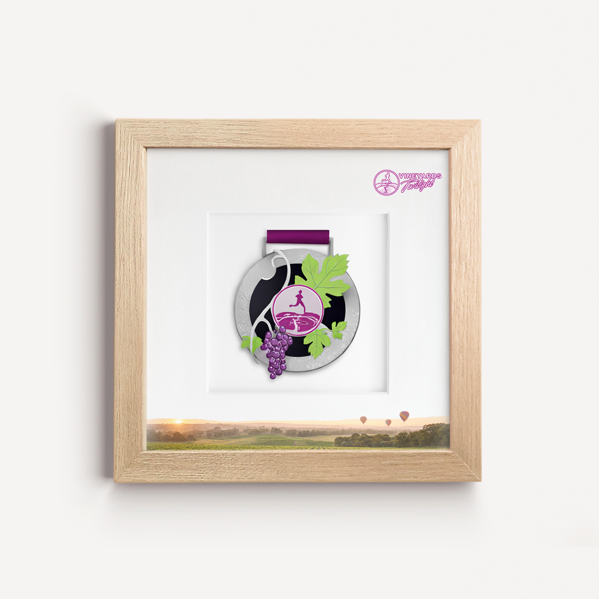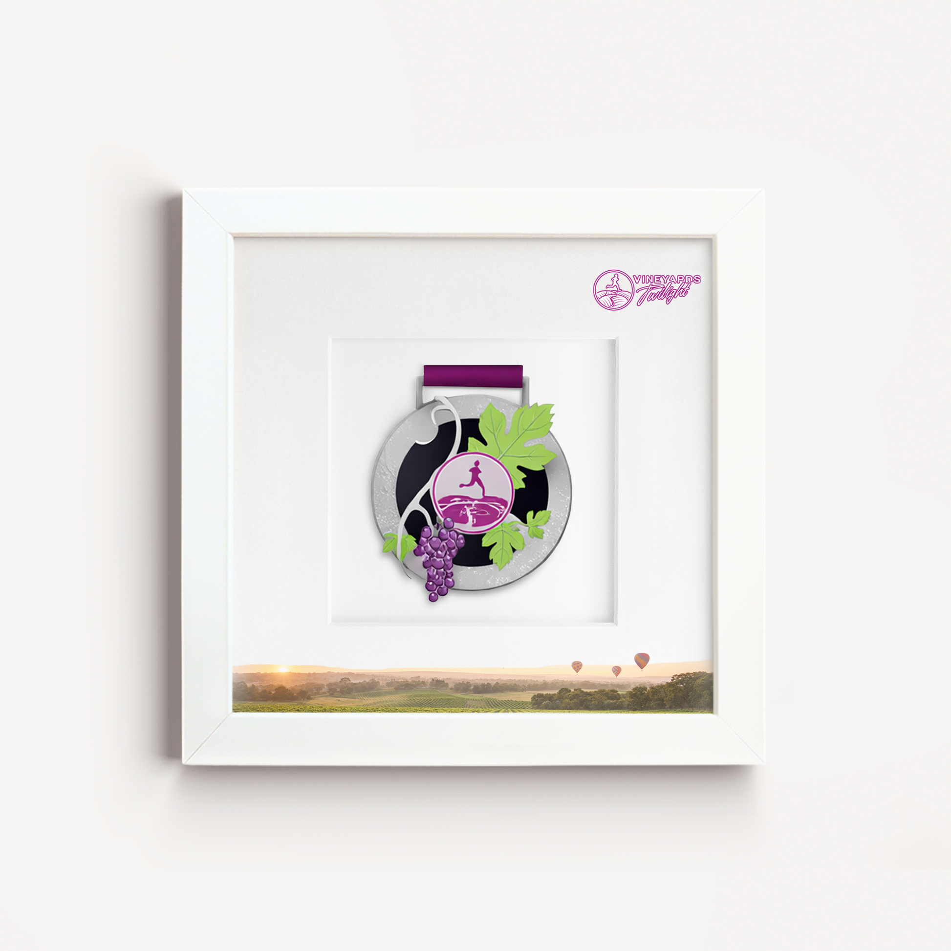 Celebrate your race achievement with the Official Vineyards Twilight Half Marathon Medal Display Frame, a modern, premium display designed for the 2026 Vineyards Twilight Run in Victoria, Australia.